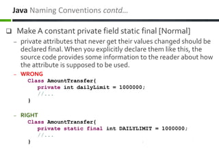 Naming conventions make programs more understandable. Java Naming Conventions for Constants. All the constants should be defined at the start of your file method or class.